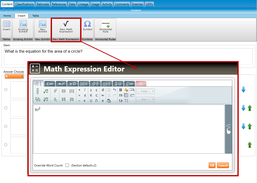 In the Insert toolbar, click the New Math Expression button to open the Insert New Math Expression dialog box.