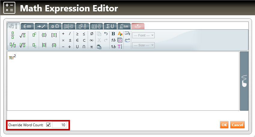To override the section default word count for the expression, click Override Word Count checkbox and provide a custom word count value for the expression (as highlighted in red below).