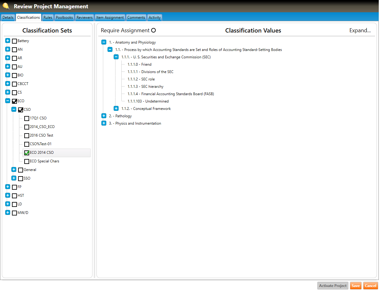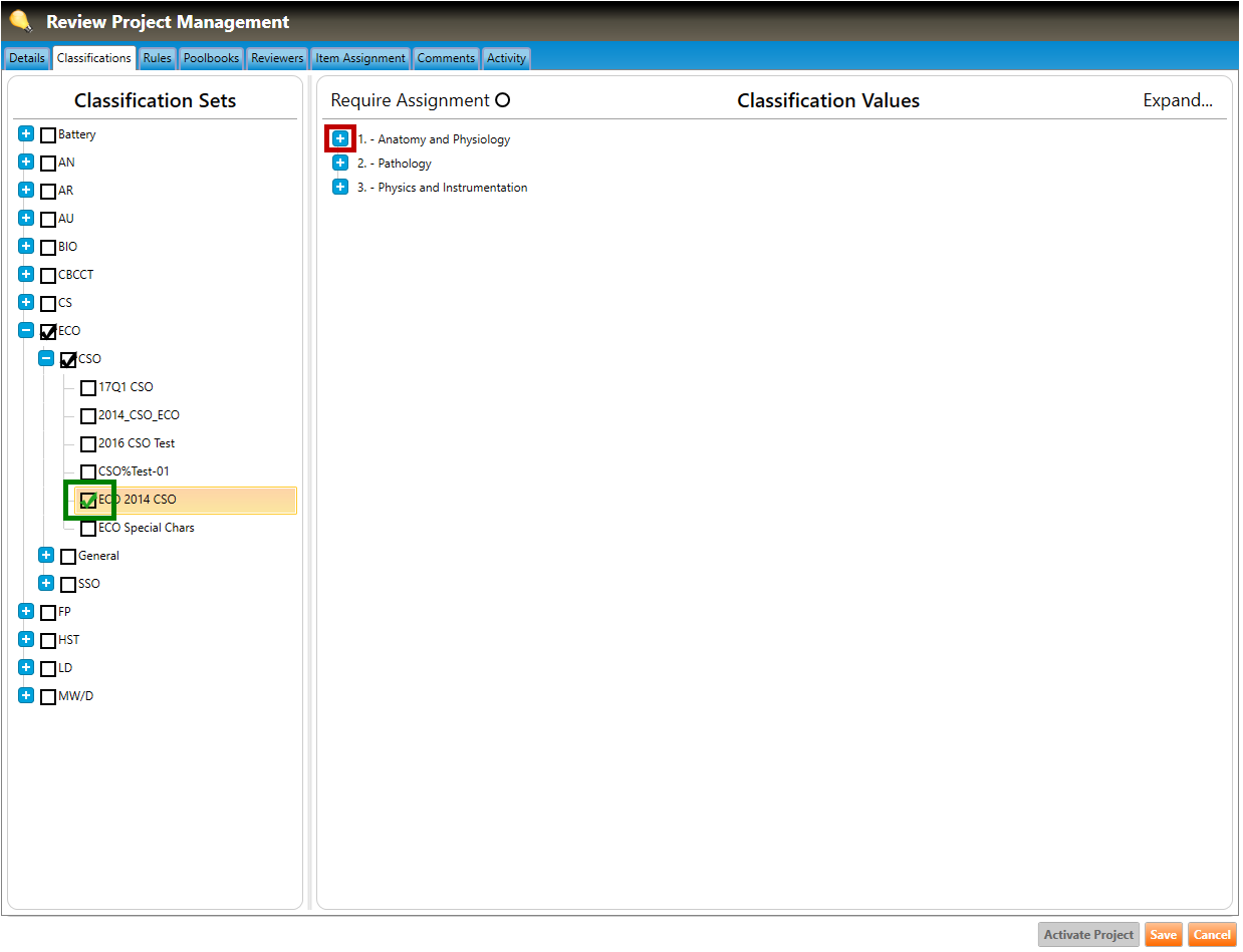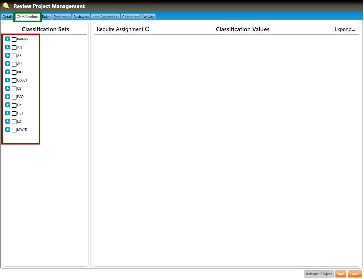 1. Navigate to the Classifications tab of the Review Project Management screen (highlighted in green, below), and click the plus signs to drill down to the classification set within the section.
