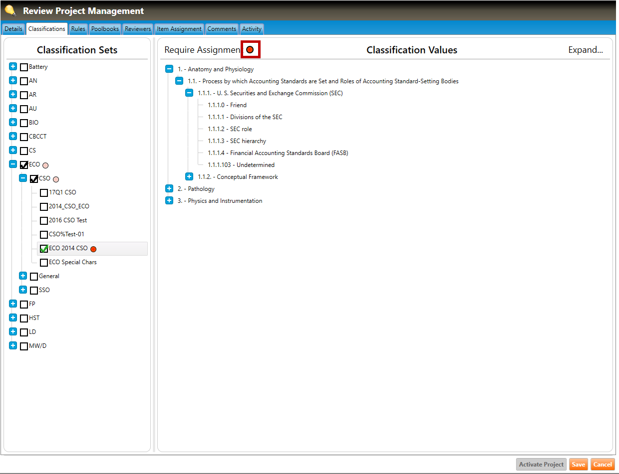4. If a classification set has been selected then that set can be identified as required for the review project by clicking the Require Assignment icon (highlighted in red, below). This will require reviewers to ensure a value from this classification set is selected when reviewing an item.