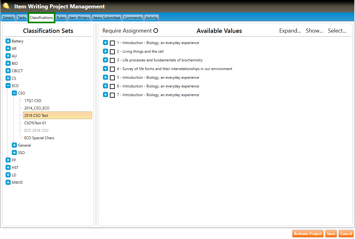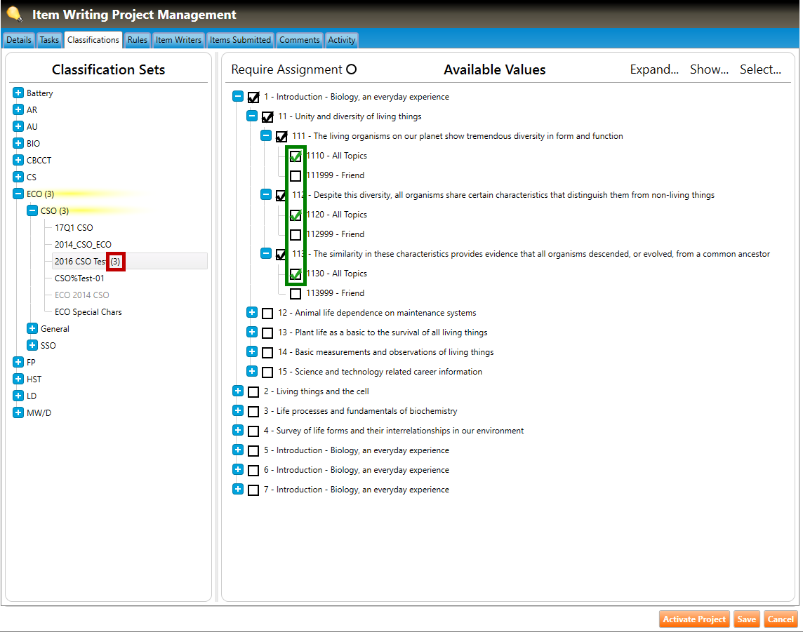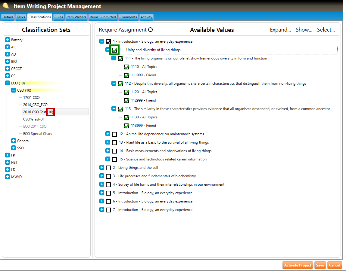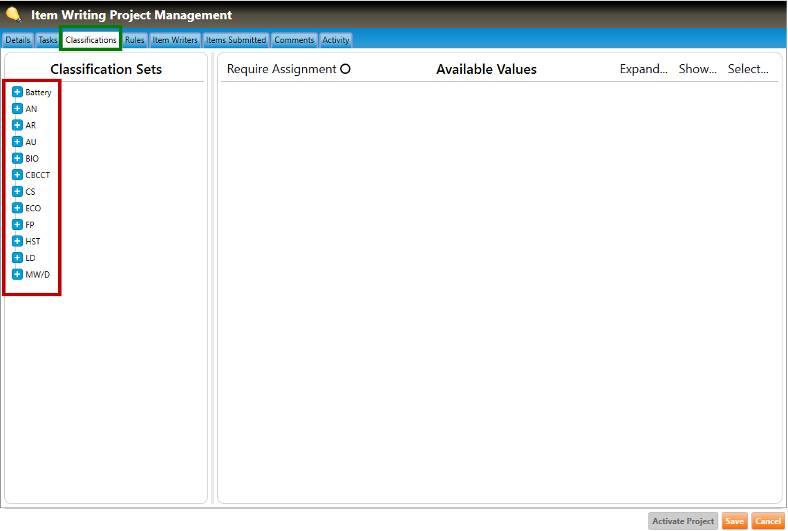 1. Navigate to the Classifications tab of the Item Writing Project Management screen (highlighted in green below), and click the plus signs to drill down to the classification set within the section.