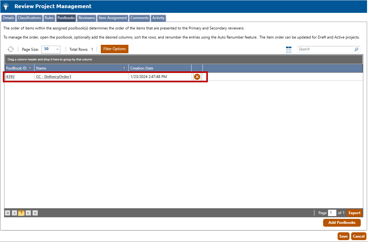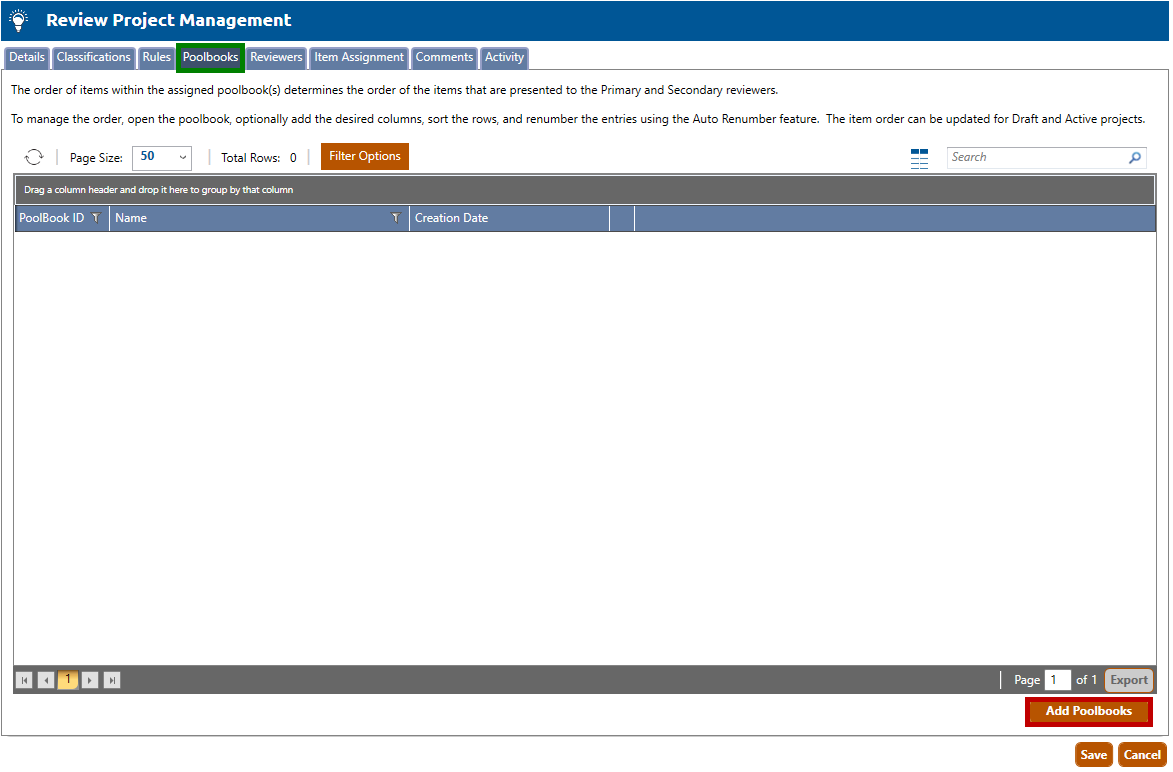 1. Navigate to the Poolbooks tab of the Review Project Management screen (highlighted in green, below), and click the Add Poolbooks button (highlighted in red, below)