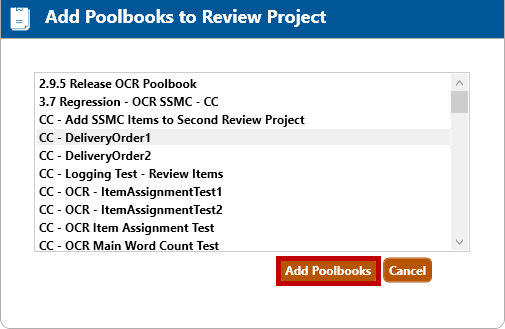2. The Add Poolbooks to Review Project pop-up will display a list of poolbooks that contain items matching the project selection. Select a poolbook from the list and click the Add Poolbooks button (highlighted in red, below).