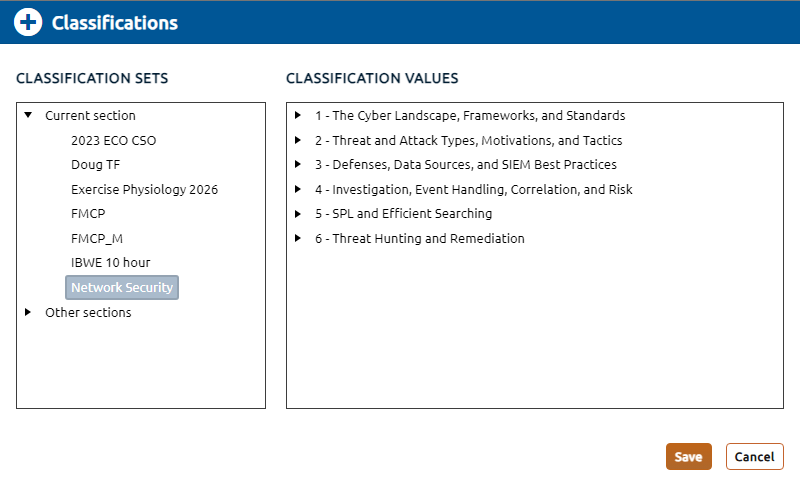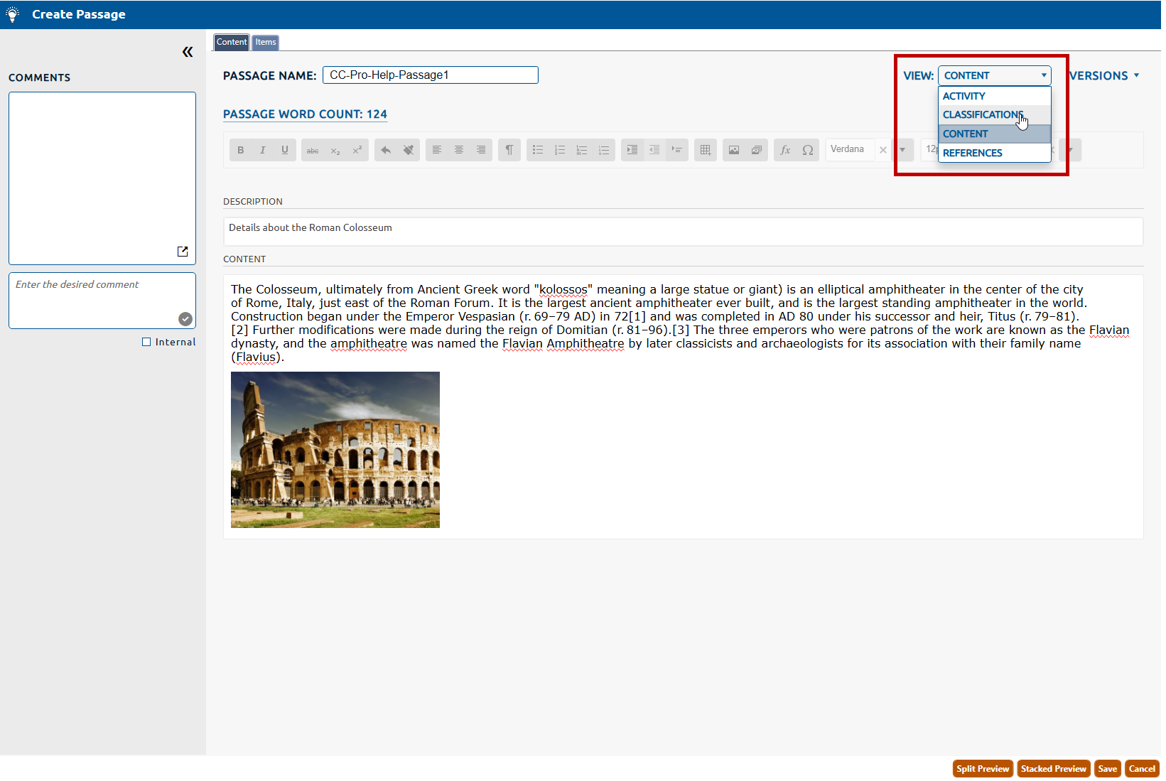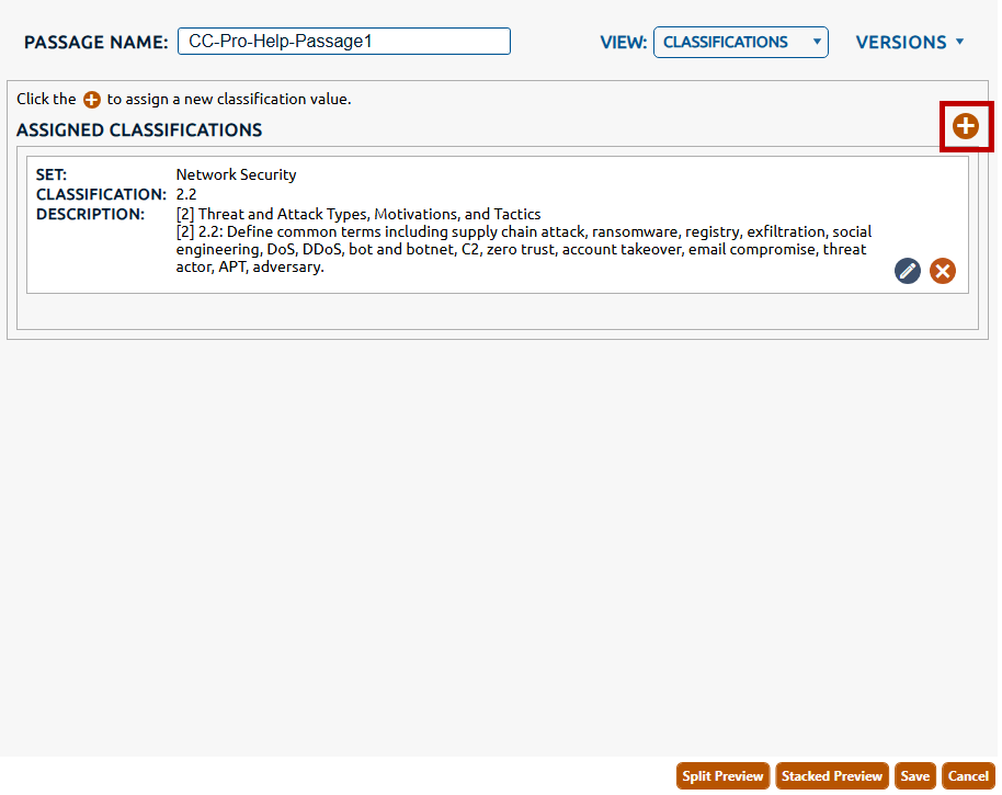 After authoring the content of a passage, you may assign classifications to the passage. Pro! stores a catalog of classification sets for each section (exam title), although sections do not share classification sets. Users will only be able to assign classifications from sections they have access to within Pro!.