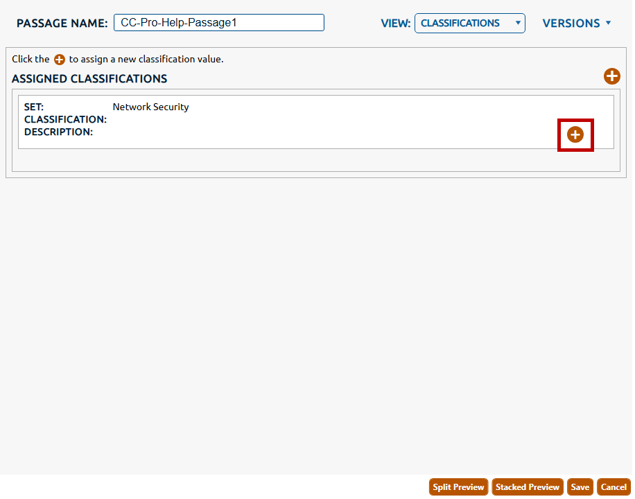 2. The Classifications view is displayed. If any default classifications are assigned to the section then they will be listed under Assigned Classifications. Click the + icon (highlighted in red, below) to assign a classification value for the default classification.