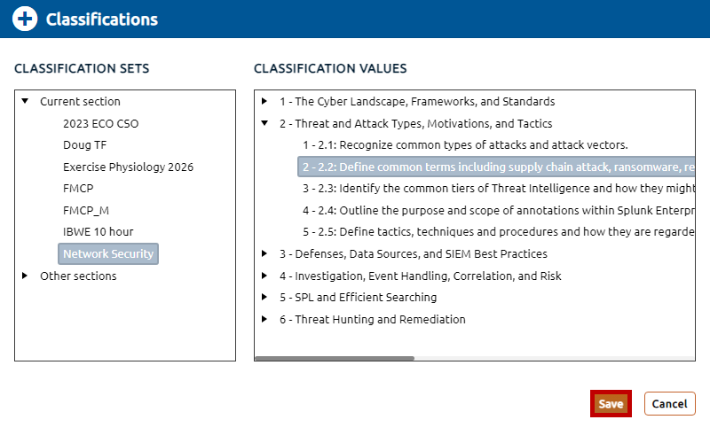 7. The list of Classification Values for the selected classification set will be displayed. Click the chevron to expand any of the displayed Classification Values and drill down through the classification levels. Click the desired classification value to be assigned. Click the Save button to persist the classification value assignment.
