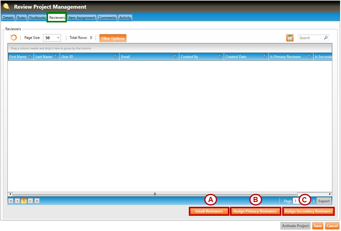 1. Navigate to the Reviewers tab of the Review Project Management screen (highlighted in green below). Follow Steps A, through C, below to add reviewers and email them.