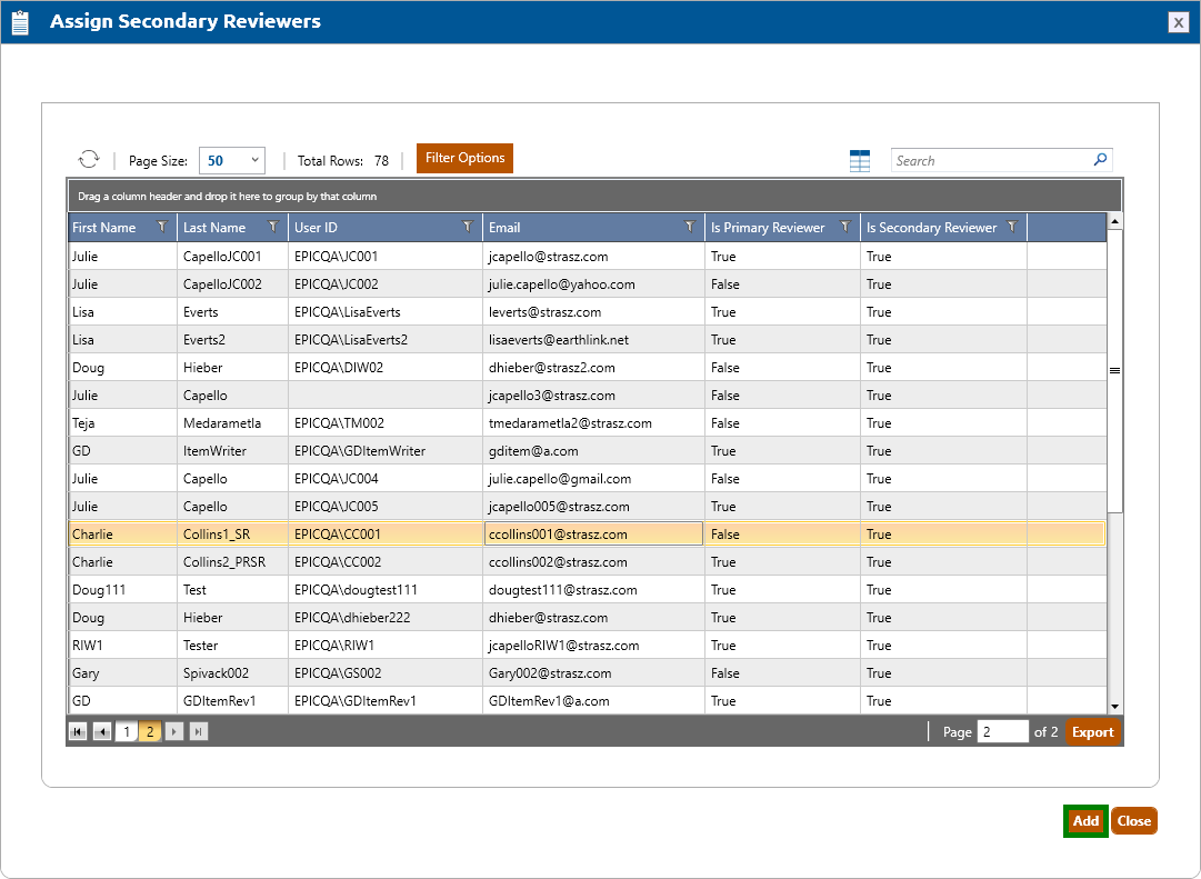 To add a secondary reviewer to the project, click the Assign Secondary Reviewers button. The Assign Secondary Reviewers popup window will appear (shown below).