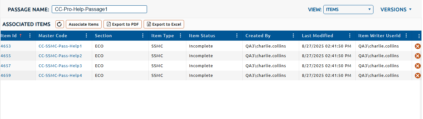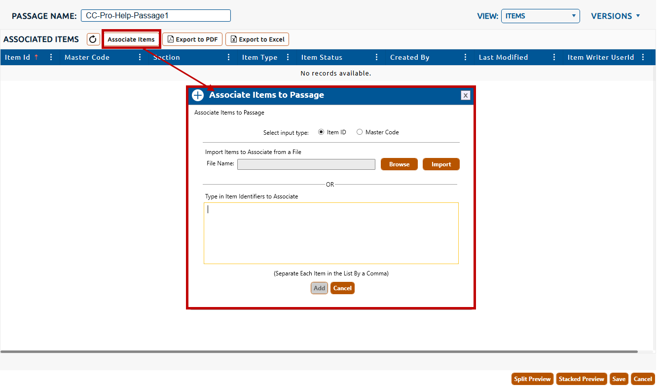 The passage creation process supports the easy association of existing SSMC and Likert items. Association can be made for a single item or in bulk for many items.