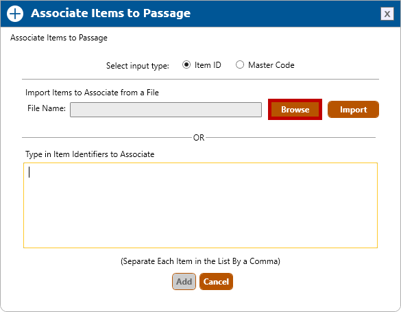 6. The selected file will populate in the File Name field. Clicking Import will populate the Type in Item Identifiers to Associate with the list of items from the file. Alternatively, the list of items can be typed directly into this field.