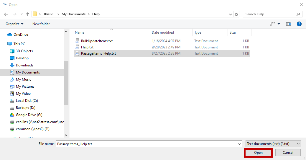 5. This opens the Open dialog to allow for file selection (.csv or .txt) from a locally mapped directory. Click Open to complete selection.