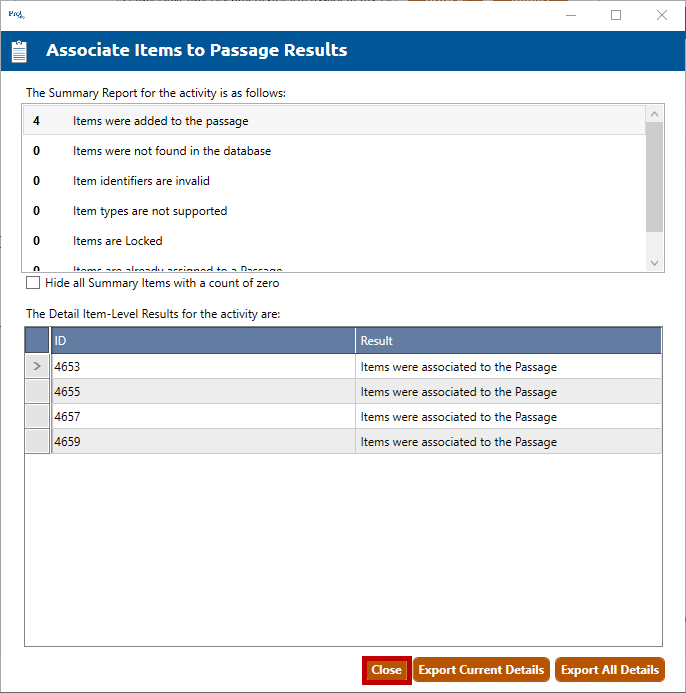 7. Clicking Add will run the item association process. The Associate Items to Passage Results dialog will display the item association results. Click Close to dismiss the dialog.