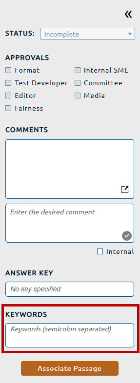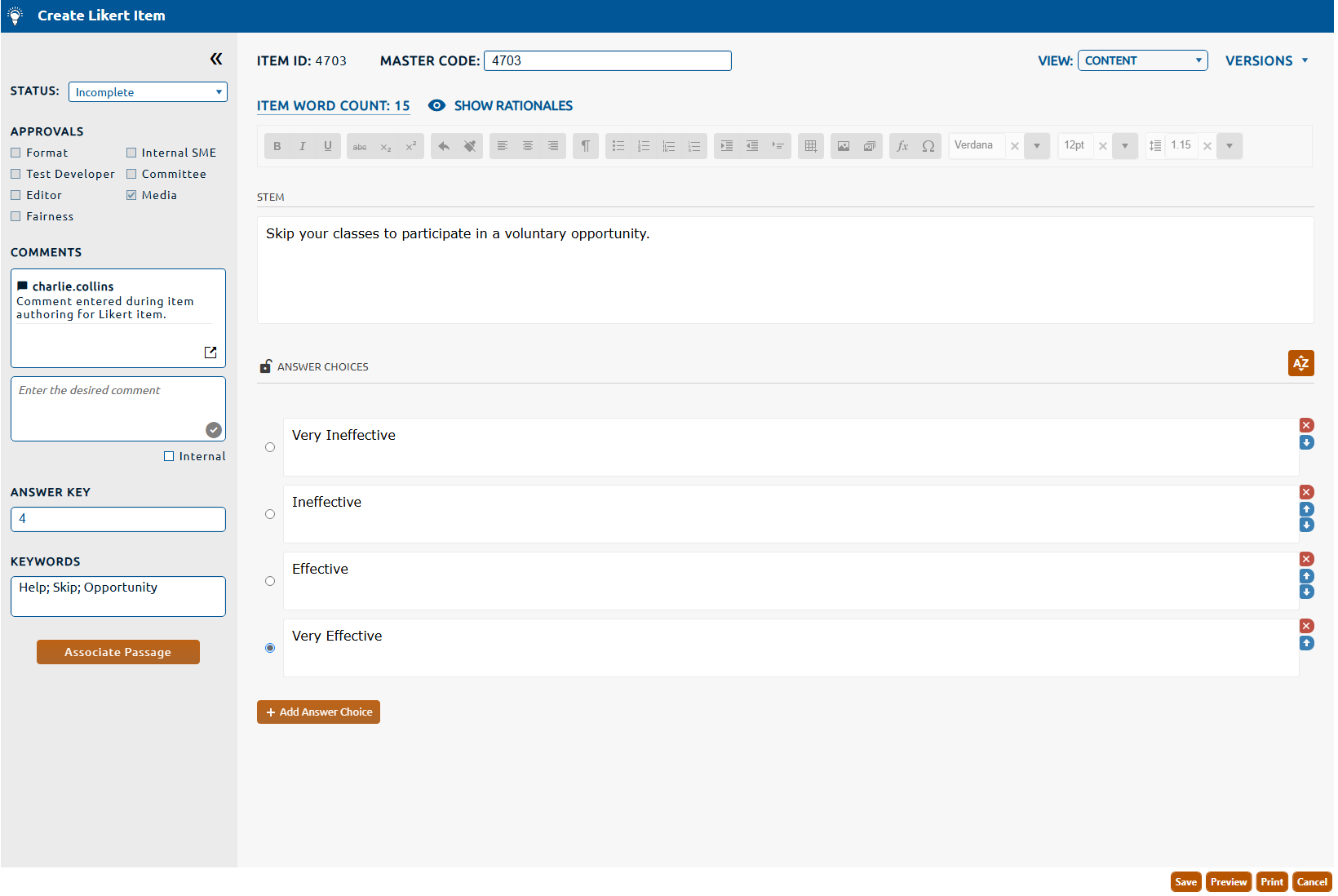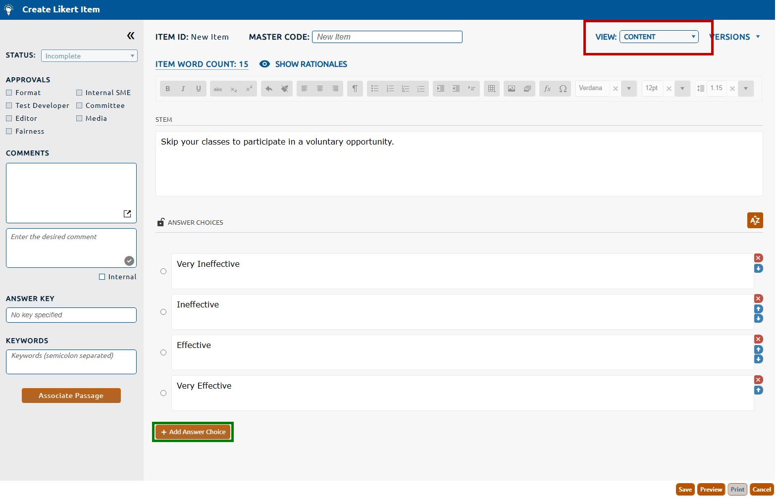 Note: A Likert item can be associated to a passage. The passage contains stimulus content that will assist the candidate in answering the question. For more information on associating a passage to an item click here.