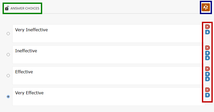 7. To alphabetize the answer choices click the AZ icon (highlighted in blue, above). Clicking this icon will position the distractors in alphabetical order based on their content.