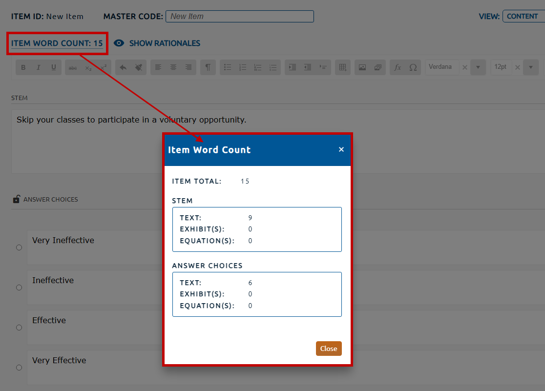 10. Content tab provides an Item Word Count (highlighted in red, below) for the item content. Selecting the Item Word Count hyperlink will open the Item Word Count dialog. This dialog will provide a statistical breakdown of the item's word count.
