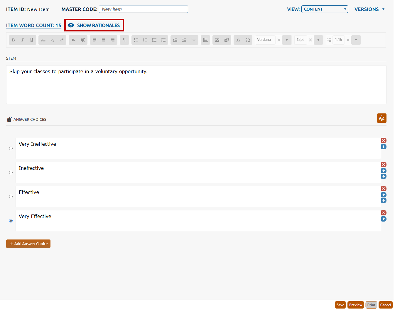 11. To enter a rationale for the item's stem and answer choices click the Show Rationales icon (highlighted in red, below).