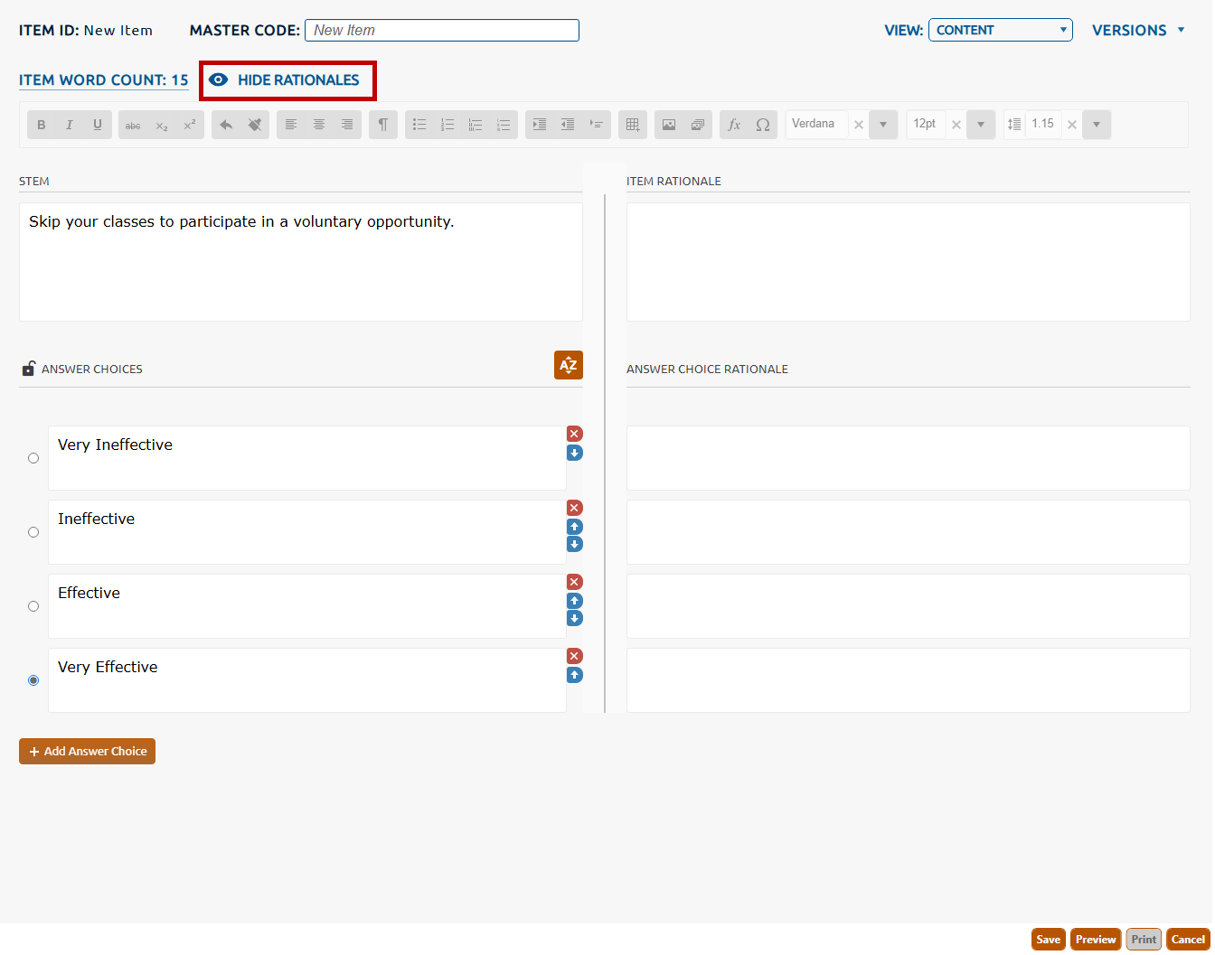 Click the Hide Rationales icon (highlighted in red, below) to hide the rationales and display the item content only.