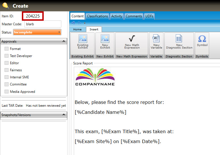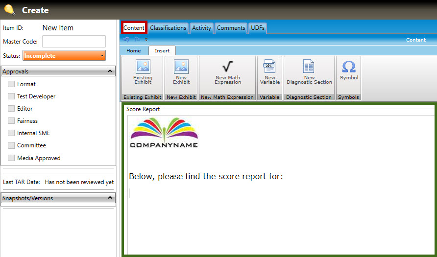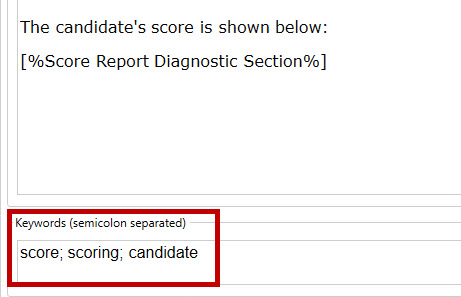 Authoring the content of a score report consists of entering the score report text, variables, and keywords (used for search purposes).