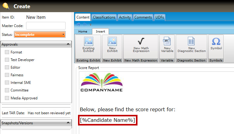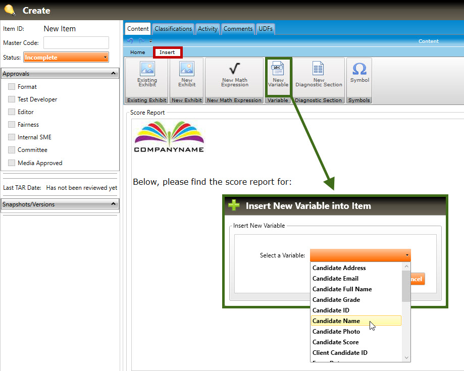 3. To insert information such as the candidate name, ID number, exam date, etc., (called variables), first select the Insert tab (highlighted in red, below). Click the cursor where you want the variable to appear. Click the New Variable button to open the Insert New Variable into Item pop-up window (highlighted in green, below).