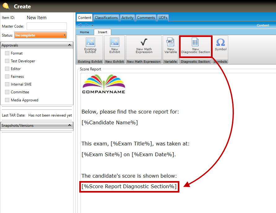 7. To add scoring information to the score report, click the cursor where you want the scoring information to appear, then click the New Diagnostic Section button (highlighted in red, below). A scoring variable will appear where you clicked the cursor.