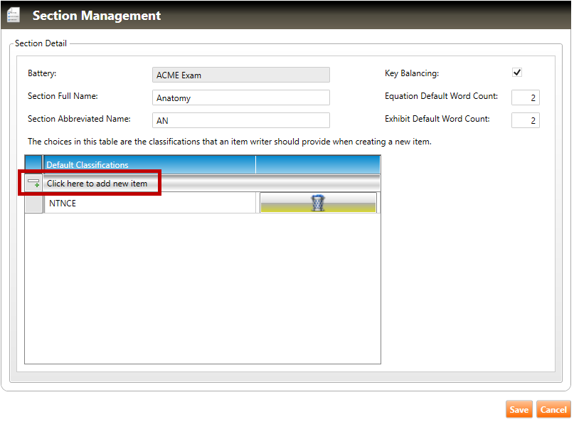5. To add a new classification to the section, click the Click here to add new item button (highlighted in red, above). When the new item appears in the table, select a classification from the dropdown list (highlighted in red, below):