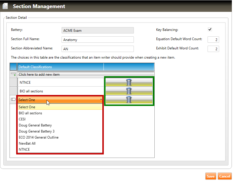6. To delete a classification, click the trash can icon next to it (highlighted in green, above)