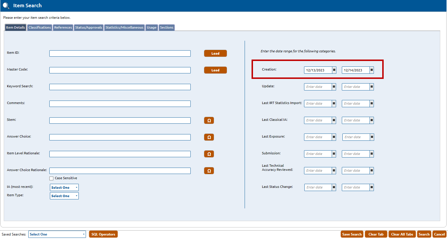 1. Perform an item search. In example below, the user is searching for items created between the date range of 12/13/2023 and 12/14/2023: