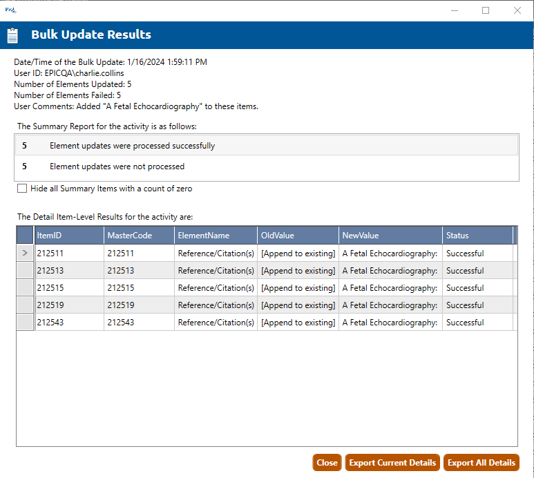 9. A Bulk Update Results window will appear, showing the results of the update: