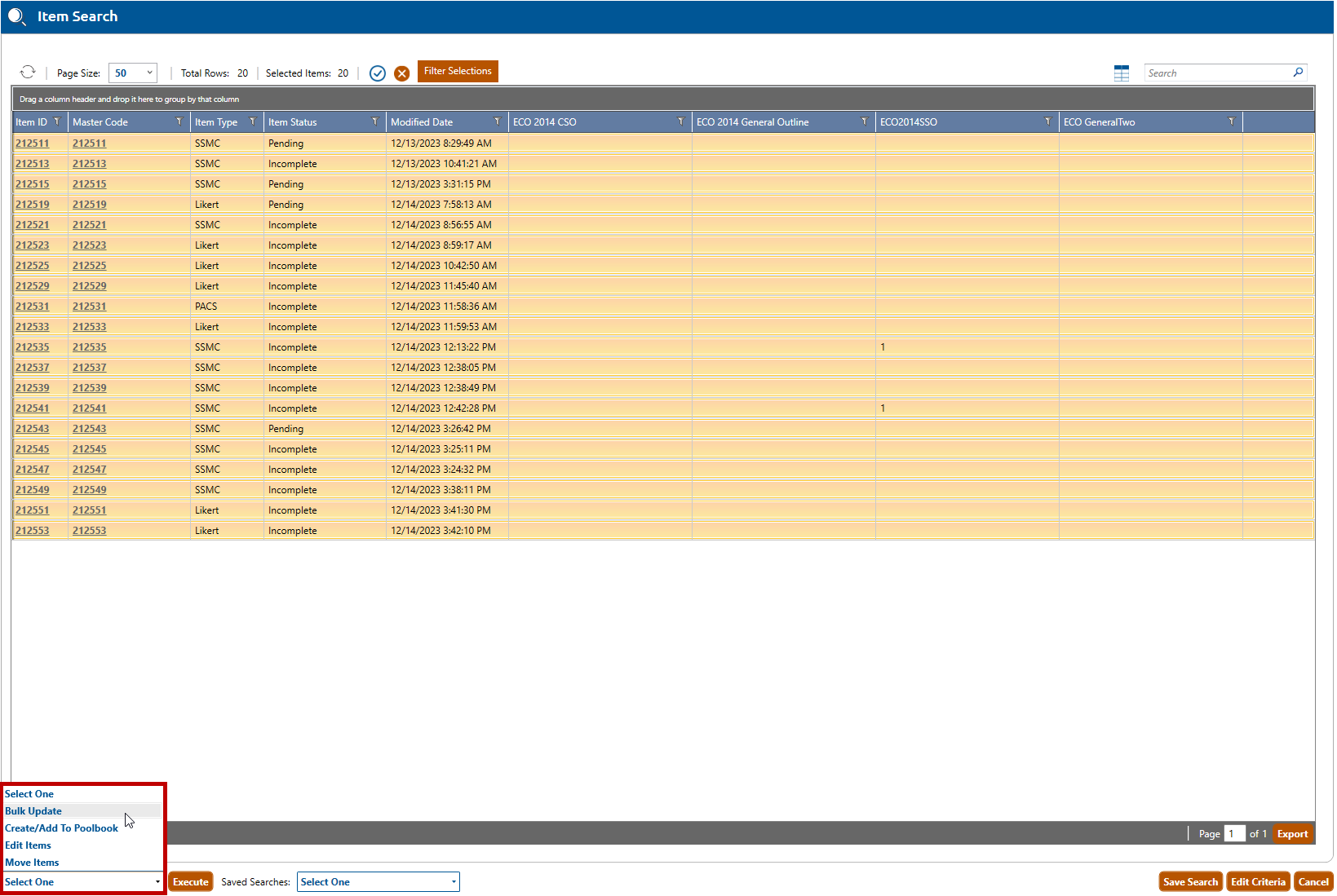 2. In the Item Search Results screen, select Bulk Update, and then the Execute button: