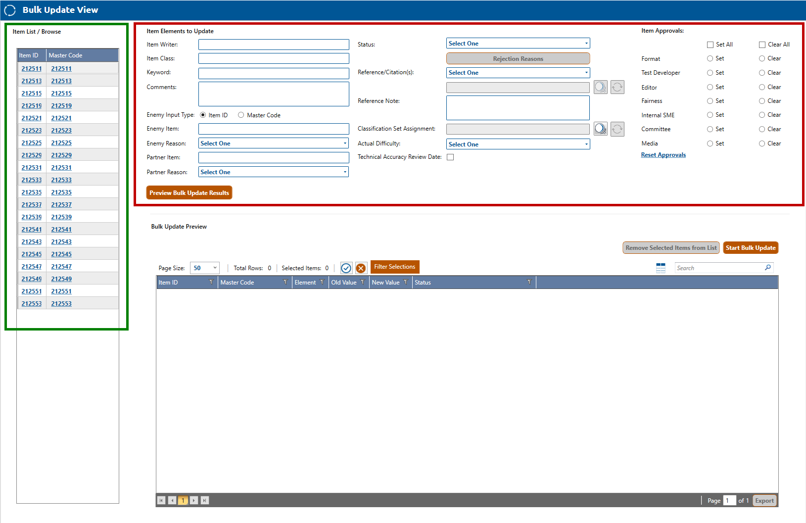 3. The Bulk Update View screen will appear, showing the selected items (highlighted in green, below):