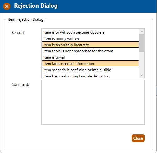 Rejection Reasons: If you choose a status of "Rejected" from the Status dropdown list (bullet above), the Rejection Reasons field will become active. Clicking it will open the Rejection Dialog box (see below). Click one or more rejection reasons from the list, then click the Close button. Note that, if “Other” is selected, a comment is required to explain the rejection. The Rejection Reasons dialog box can be used to edit previously-entered reasons and comments.