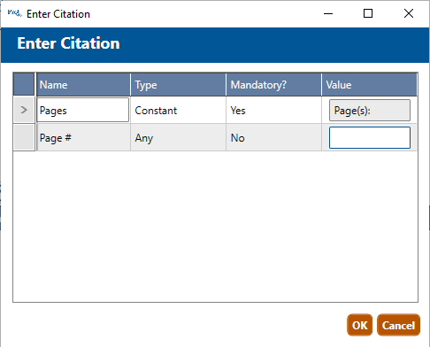 Reference/Citation(s): Title of the reference and value of the citations for the items. Citations are entered by clicking on the binoculars button next to the text box to open the Enter Citation window (see below). Note that citation values are only required when flagged as mandatory. Also note that the values entered will be appended to any existing reference/citations for the items being bulk updated.