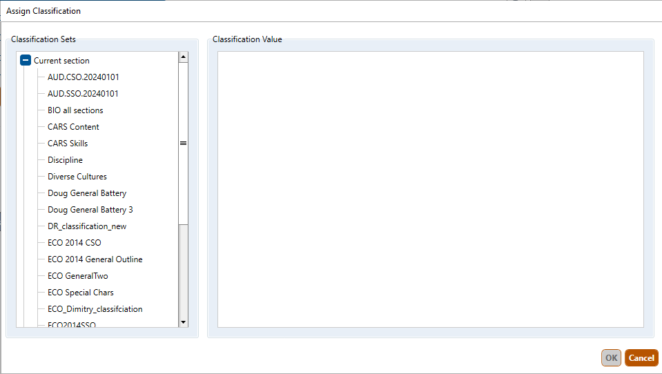 Classification Set Assignment: The classification definition and values assigned to the items. Clicking on the binoculars button opens the Assign Classifications window, which allows you to make your selection(s).