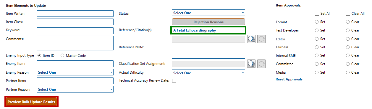 5. After entering the data to bulk update (in the example below, highlighted in green, the user wants to update all of the selected items with an additional reference, "A Fetal Echocardiography"), click the Preview Bulk Update Results button (highlighted in red, below):