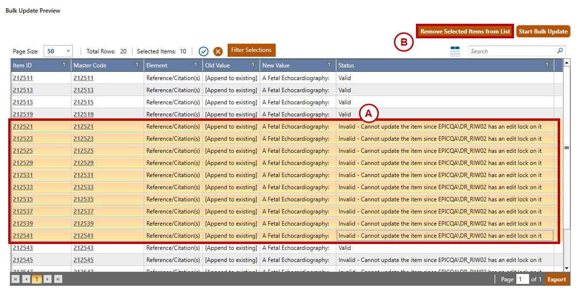 6. In the Bulk Update Preview section of the screen (shown below), the tabular display will list the changes about to be made. The Status column will indicate which selected items will be Valid or Invalid after the bulk update. To remove invalid items from the bulk update: