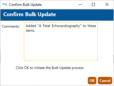 7. Click the Start Bulk bUpdate button. A Confirm Bulk Update dialog box will appear (see below). Enter any comments about the bulk update, then click the OK button to initiate the bulk update process: