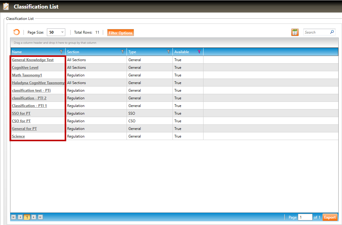 2. The Classification List screen will appear, showing all available classifications within the section, or for the section you are currently logged into (in the example below, the user is logged into the Regulation section).