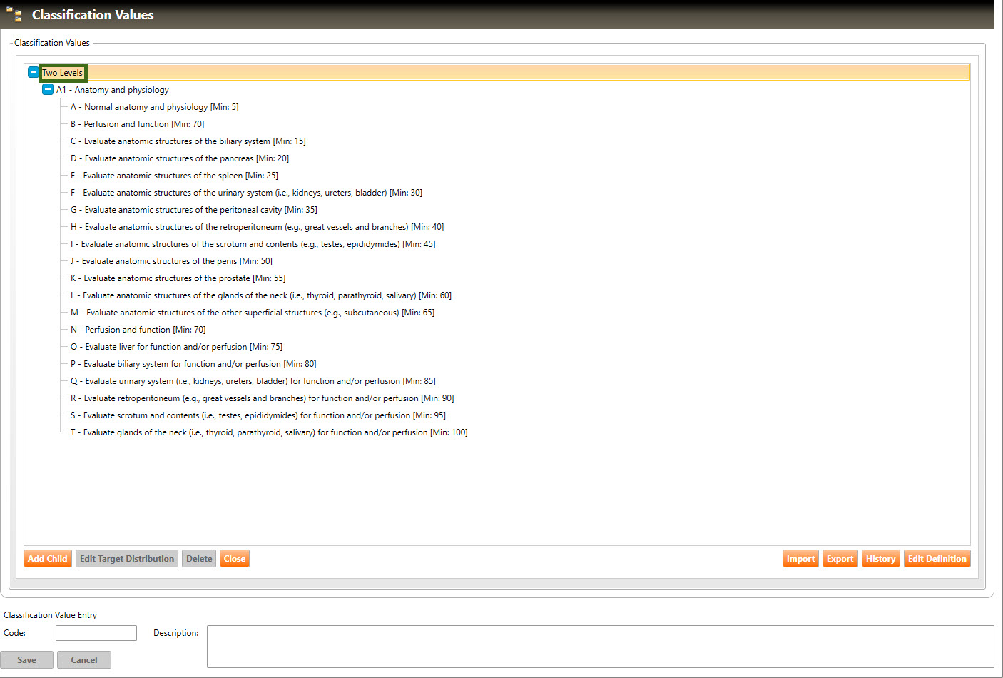 3. Click any of the classification Names (highlighted in red, above) to open that classification. In the example below, the user has opened the Two Levels classification (highlighted below):
