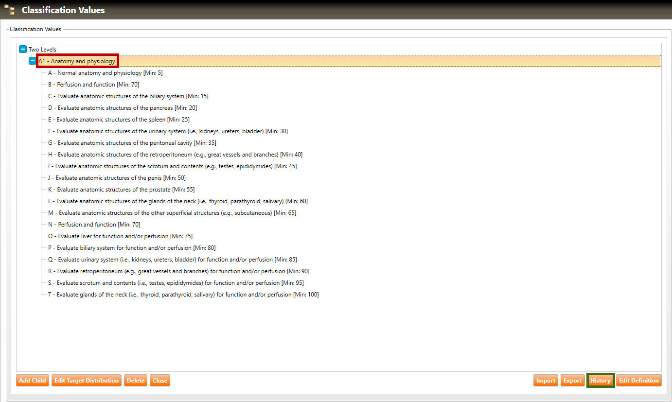 5. To view the history of actions performed on a classification value, select the desired value (highlighted in green, below), then click the History button (highlighted in red, below):
