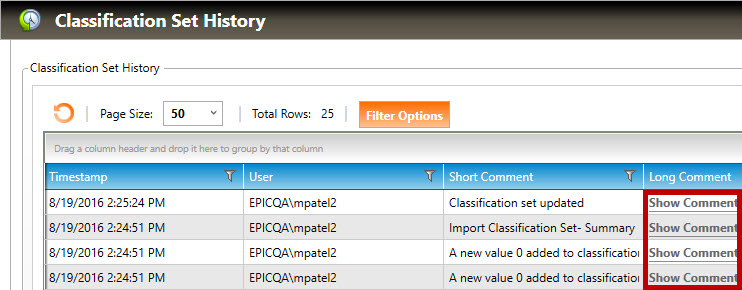 7. To see detailed information for any item in the Classification Set History, click any of the Show Comment links (highlighted above) to open its View Long Comment window: