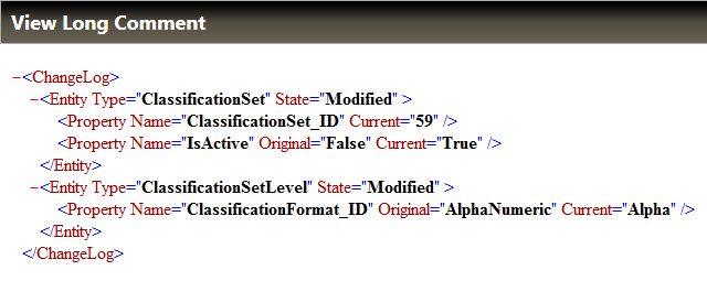 6. The Classification Set History for that value will appear, showing the action performed (Short Comment), timestamp for the action, and the user who performed the action: