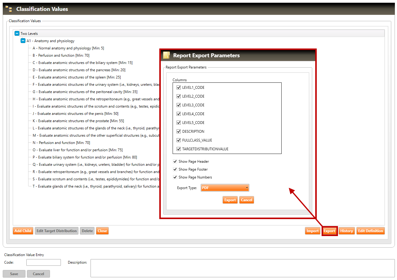 8. To export the Classification Values for the selected Classification Set, click the Export button (highlighted in red below) and the Report Export Parameters dialog box will appear:
