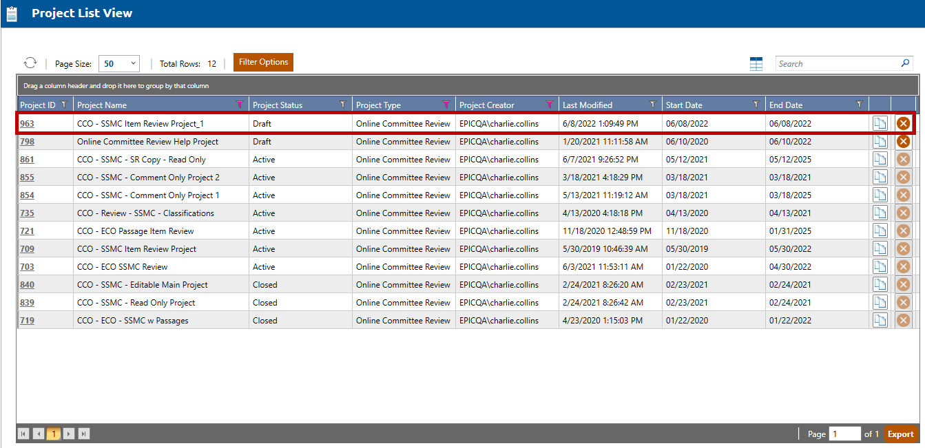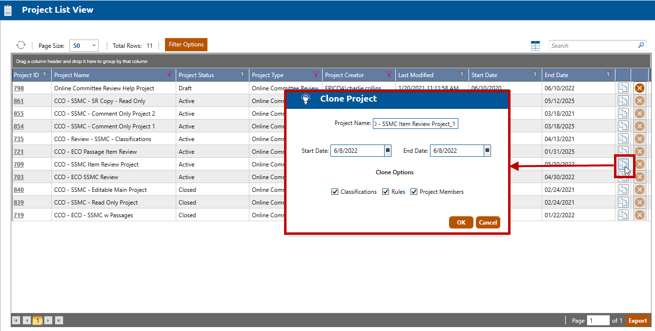 2. The Project List View screen will appear (shown below). Click the Clone button for the project you wish to clone (highlighted in red, below) to open the Clone Project popup window: