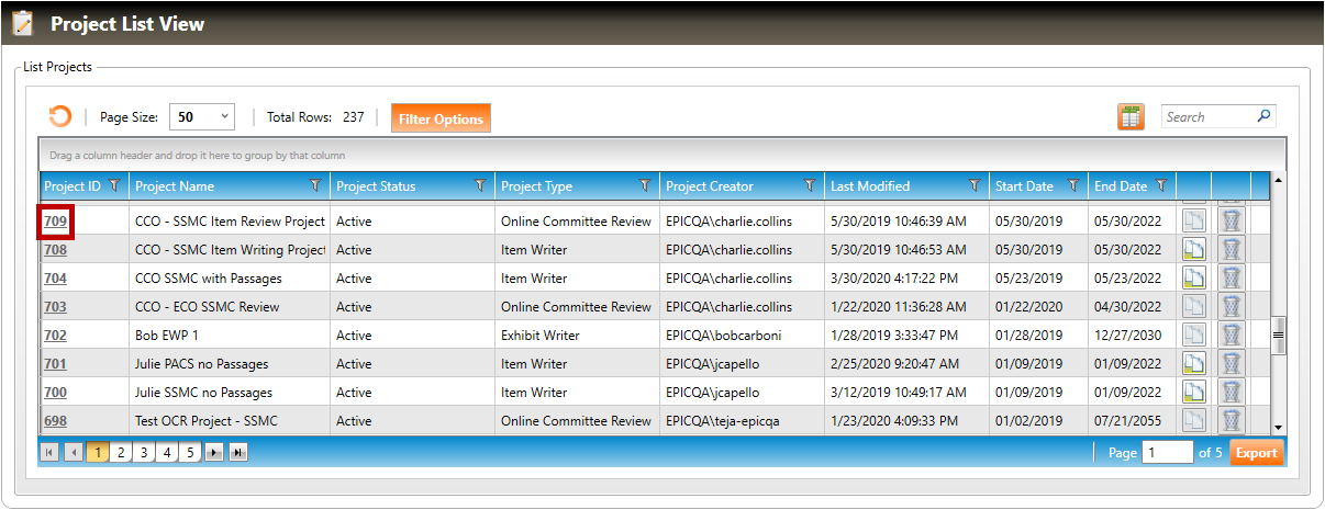 2. The Project List View screen will appear (shown below). Click the Project ID hyperlink for the project you wish to close.