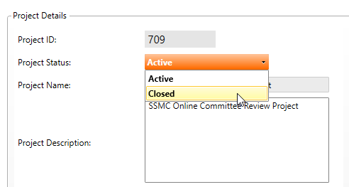 3. The Review Project Management screen will appear open to the Details tab. From the Project Status dropdown, select the Closed option from list. Click Save.