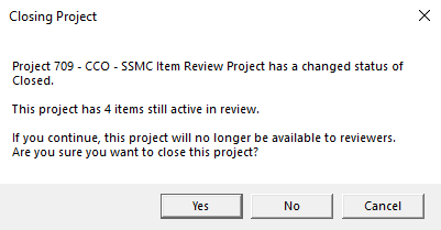 4. A confirmation message will appear (shown below), warning that the project when closed will no longer be available to reviewers. If there are any items currently in active review for the project, the message will also provide a count. Select Yes to continue closing the project. Select No or Cancel to keep the project open.