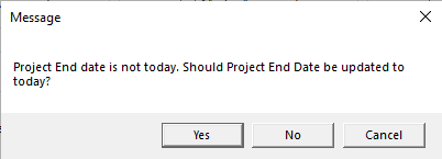 5. A confirmation message will appear (shown below), asking if you wish to update the Project End Date to today. Select Yes or No (both of these choices will end the project). Select Cancel to keep the project open.