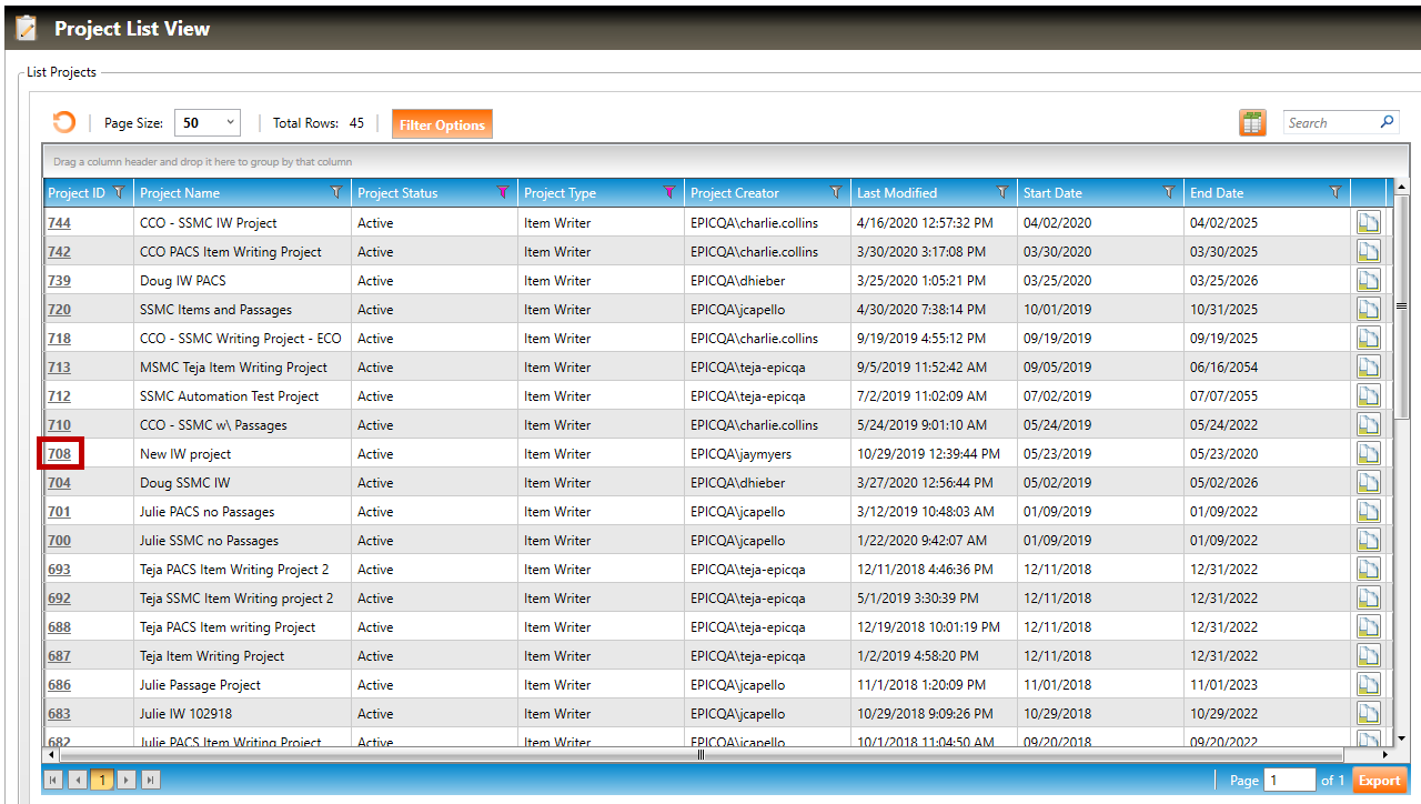 2. The Project List View screen will appear (shown below). Click the Project ID hyperlink for the project you wish to close.