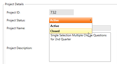 3. The Item Writing Project Management screen will appear open to the Details tab. From the Project Status dropdown, select the Closed option from list. Click Save.