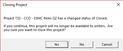 4. A confirmation message will appear (shown below), warning that the project when closed will no longer be available to item writers. Select Yes to continue closing the project. Select No or Cancel to keep the project open.